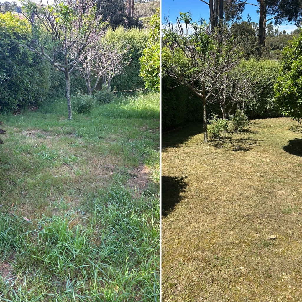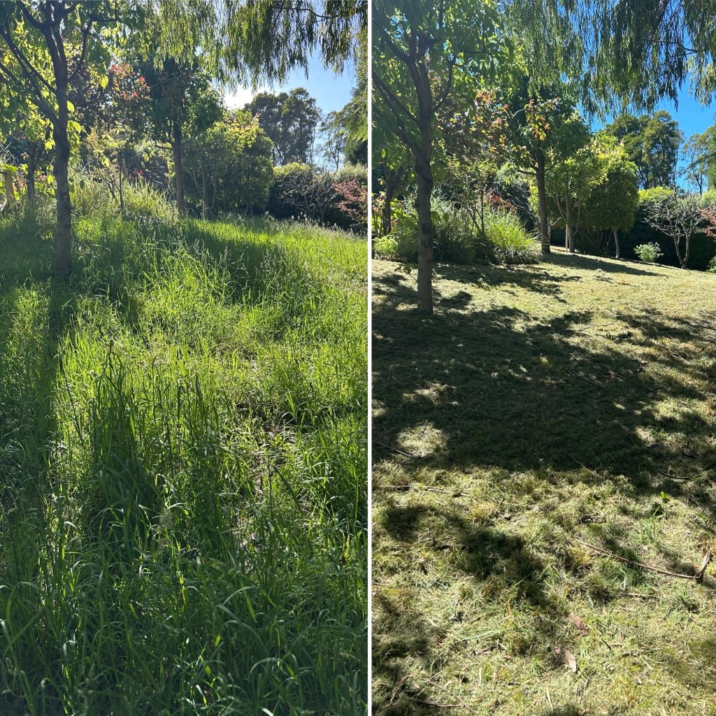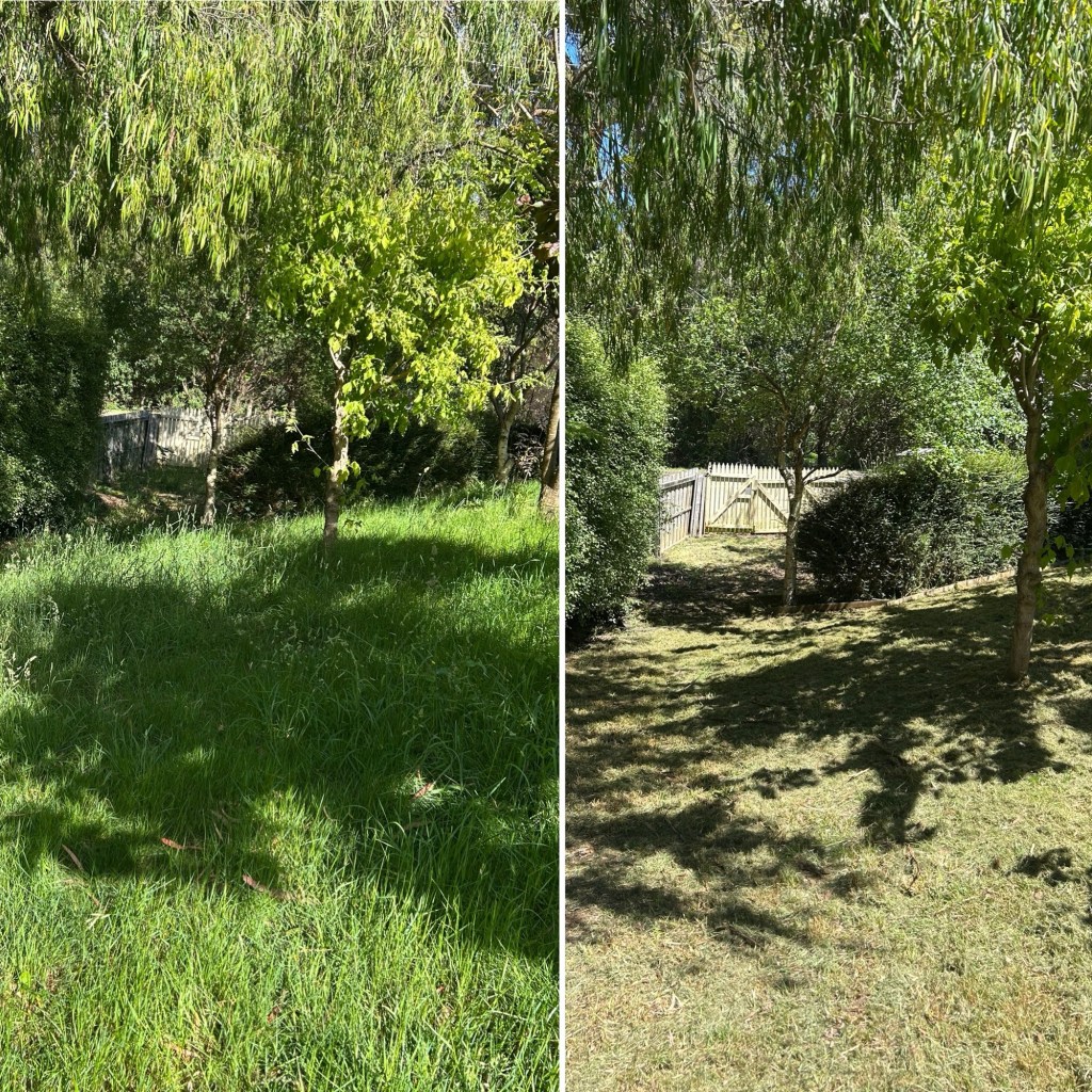 We started by tackling the overgrown lawn with our professional-grade equipment, carefully cutting back the long grass while maintaining the health of the turf. Once the lawn was mown, we trimmed the edges to create sharp, clean lines around the trees, fences, and pathways. Finally, we tidied up the garden beds, removing debris and unwanted growth to create a polished finish. The transformation was striking, as the photos clearly show – from an unkempt yard to a beautifully maintained outdoor space ready to be enjoyed again.